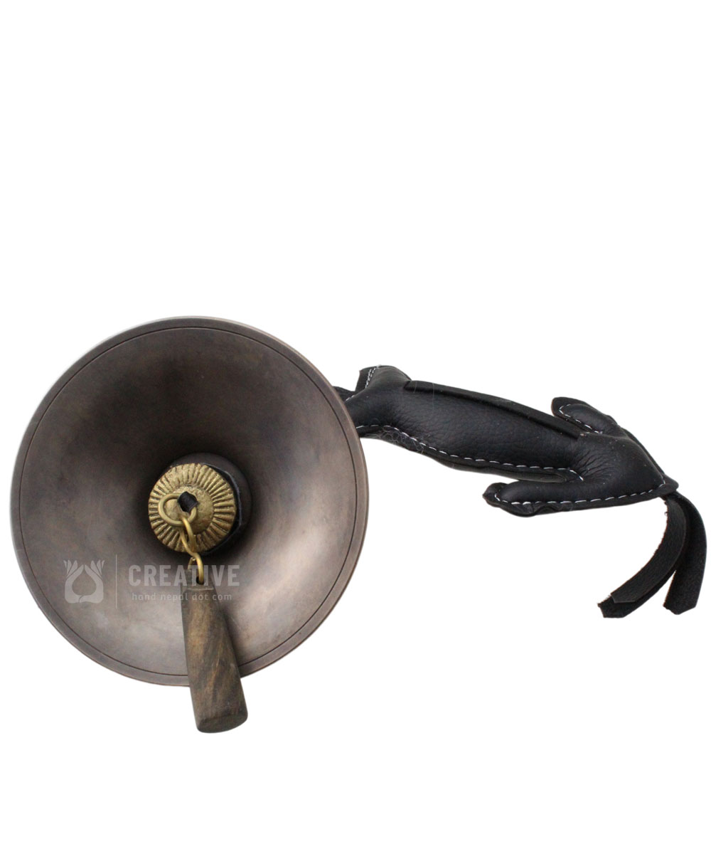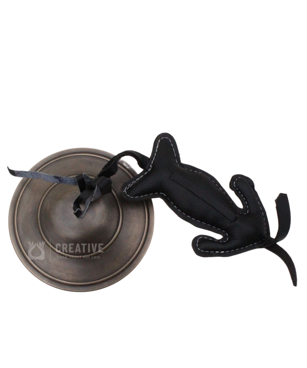 Antique Finishing Tibetan Plain Tingsha Bell and Buffalo Horn.The hand strap is made of Buffalo Leather. The striker is made of Buffalo horn. Tibetan uses this bell for ritual performance in Shaman ceremony. Approx 5.5 inch diameter