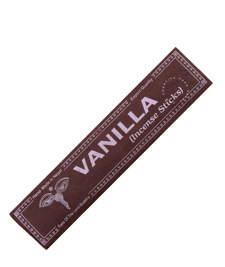 Vanilla Incense sticks . Made from natural ingredients. Packaging is made from traditional imperishable Nepalese handmade paper . Approx 9 inch long & each packet has 15 sticks