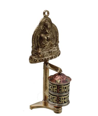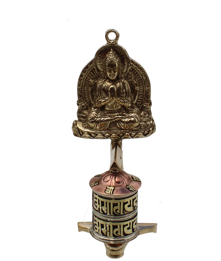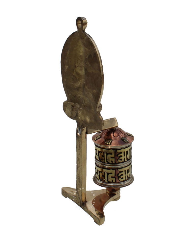 Copper Wall Mount Prayer Wheel with Chenrezig. Copper prayer wheel with brass stand and Chenrezig .There is a Tibetan Buddhist mantra written around the inside of this prayer wheel. You can either place on table top or mount it on the wall. It is Approx 17 x 7 cm.