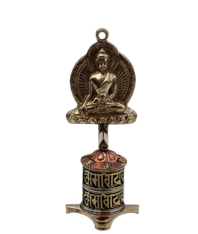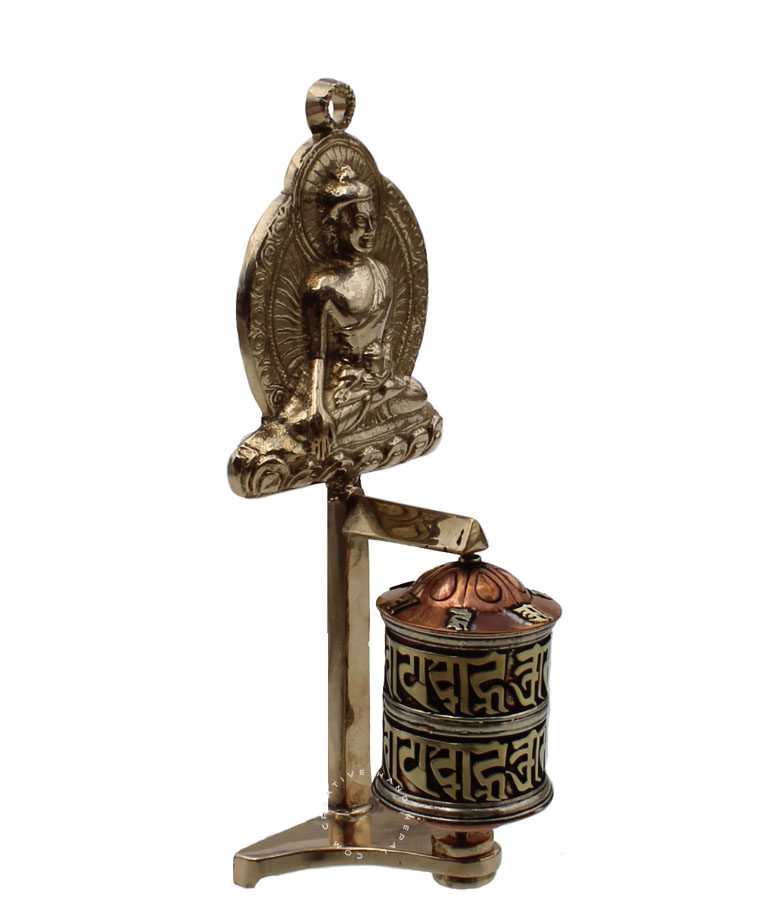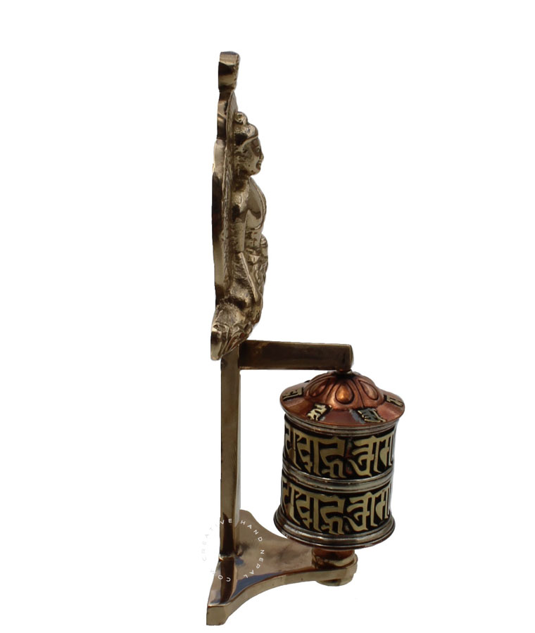 Copper Wall Mount Prayer Wheel with Lord Buddha Copper prayer wheel with brass stand and Lord Buddha .There is a Tibetan Buddhist mantra written around the inside of this prayer wheel. You can either place on table top or mount it on the wall. It is Approx 17 x 7 cm.