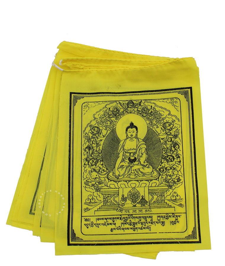 The prayer flag with image of Medicine Buddha helps in healing and maintaining good health, thus enabling us to accomplish our goals successfully.These flags are made from cotton and polyester material. Approx 6 x 7.5, Set of 10 Flags
