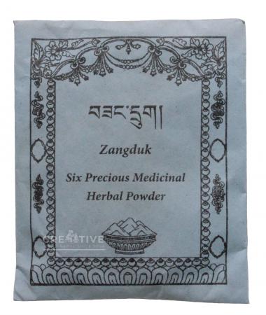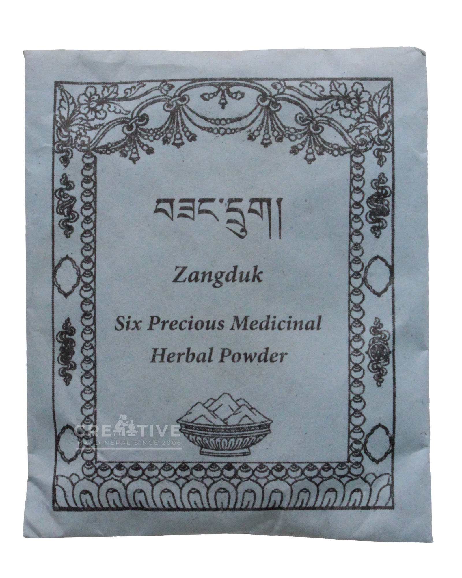 Zangduk Six Precious Medicinal Herbal Powder, Zangduk Six Good is a traditional Tibetan blend of six sacred ingredients used for consecration and purification. This herbal powder includes crushed cloves, nutmeg, green cardamom, black cardamom, saffron, and bamboo manna chugang. It is traditionally mixed with water to coat the inside of statues or used during fire offering rituals for spiritual cleansing and blessing.